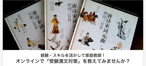 この度、学生時代又は現在も職業として、家庭教師や塾講師、プライベートチューター等で指導経験を積まれている方を対象に、時間と場所を選ばずに受験生の支援が可能な「オンライン漢文家庭教師」の募集ページをリリースしました。
