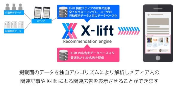 『X-lift(クロスリフト)』 は、X-lift掲載メディアの対象の記事を自然言語処理(注2)により解析し、ユーザーの行動解析データとあわせてデータベース化したうえで機械学習(注3)機能によりコンテンツ及び広告配信の最適化を支援するサービスです。