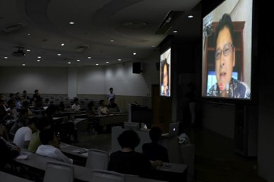 その後は、メインプログラムに入る前に、琉球大学観光産業科学部の大角玉樹教授から本日参加されている学生に向けて、約5分間のメッセージを頂戴しました。メッセージはバンクーバーからのビデオチャットとなりましたが、「21世紀にふさわしい、新たな価値を生み出すのは起業家」、「イノベーションは多様性の中から生まれる」などの言葉に、学生のみならず一般の参加者まで深く聞き入っていました。そして、「21世紀にふさわしい起業家育成を目的とした、産学恊働教育」としてRyukyu Startup Challengeをご紹介いただくとともに、「22世紀を創造する起業家が次々と誕生し、沖縄が近い将来『起業アイランド』と呼ばれる日が来ることを楽しみにしています。」との言葉で結ばれました。