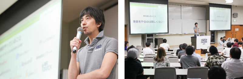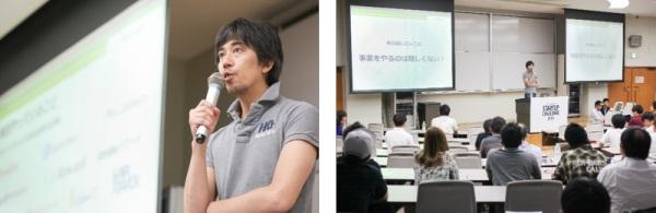 メインプログラム前半では、株式会社サイバーエージェント執行役員の内藤 貴仁氏から、「普通に生きないということ」をテーマに講演をいただきました。講演では、自身のこれまでの経歴を、「サイバーエージェント入社」、「サイバーエージェントアドマネジメント設立」、「サイバーエージェント取締役就任」、「アドテク本部設立」という4つの転機に切り分けて紹介、各節目でのエピソードを踏まえながら、これから起業を行う若者たちに対し「事業をやるのは難しくない!」と話されました。また、実際に起業を行うにあたって、「伸びる分野を見つけ、若者が勝てる分野か見極めること」の重要性について説明いただいた上で、「若者でも勝てる!」、「伸びる分野を見つけることができれば、会社づくりの半分はおわり。ぜひ伸びる分野を見つけて、挑戦してください!」と締めくくられました。