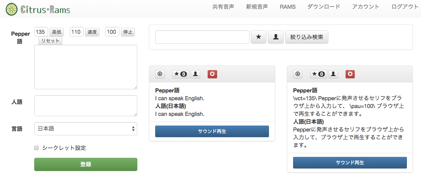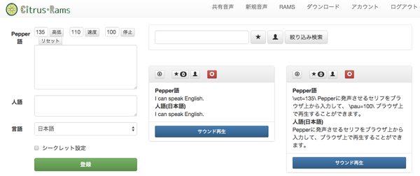 当ソフトウェアは、同社が提供するロボットアプリケーション・コンテンツ開発支援ソフトCitrus Rams(シトラスラムス)の一機能として提供され、無償で利用する事が出来ます。Citrus Ramsは現在、ソフトバンクロボティクス社のPepperに対応しており、ユーザーはPepper向けのアプリケーションで発話調整を行う事が出来ます。