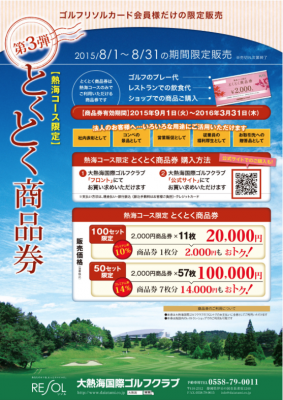 ゴルフ場やホテル、複合リゾート等の運営&運営受託から、企業や団体の福利厚生代行サービスまでを通してリゾートの再生・活性化を手掛けるリゾートソリューション株式会社(略称:リソル、東京都新宿区、多賀道正社長)の直営ゴルフ場のひとつ「大熱海国際ゴルフクラブ」(静岡県伊豆の国市)では、ゴルフのプレー代はもとより、レストランの食事代、ショップでの商品購入にも使える『とくとく商品券』(第3弾)を企画。ゴルフリソルカード会員様だけの限定で好評販売中です。