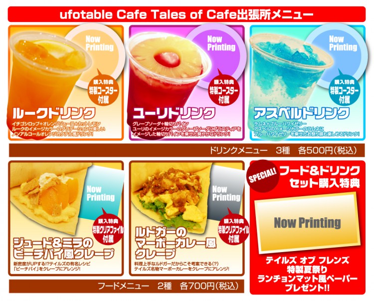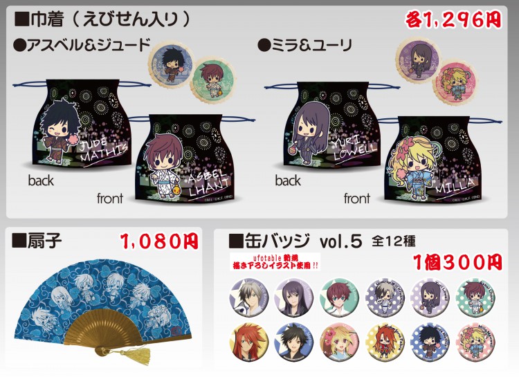昨年に続き、2度目の開催となった夏祭りイベント、今年は更にパワーアップした内容で開催します。“縁日”では、ヨーヨー釣りや射的といった催しを実施。参加して貰える景品はイベント限定グッズとなります。また、イベントの開催記念商品も会場で限定販売します。缶バッジにはufotable新規描きおろしイラストを使用し、夏祭りにぴったりのラインナップとなっています。さらに、「Tales of Café出張所」が今年も出店が決定。入場者には同じく描きおろしイラストを使用した「テイルズ オブ 夏祭り2015Ver.うちわ」を無料プレゼントします。夏をしめくくるにぴったりのイベント、ぜひご期待ください。