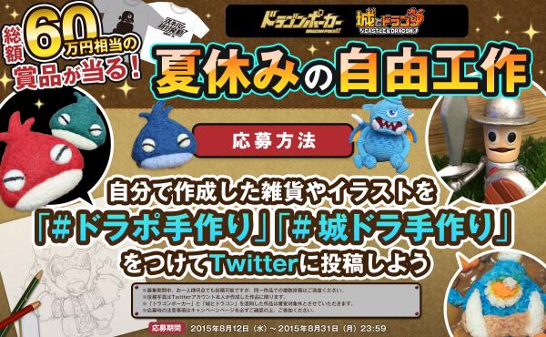 『ドラゴンポーカー』または『城とドラゴン』をテーマにしたぬいぐるみやキャラクター弁当、切り絵、粘土などの手作り作品を写真撮影して、Twitterに投稿してください。投稿いただいた作品の中から ビックリ作品、オモシロ作品、ヘタウマ作品など、幅広い視点で審査・表彰させていただきます。皆様からのたくさんのご応募お待ちしています。