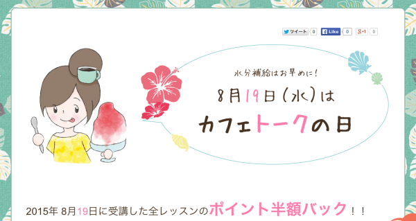 ご受講頂いたレッスンが最大3件まで、後日半額ポイントバックされる「カフェトークの日」。夏休み真っ只中のお子様の夏期学習から、大人の夏のご趣味追求までを応援すべく、8月も19日に開催致します!