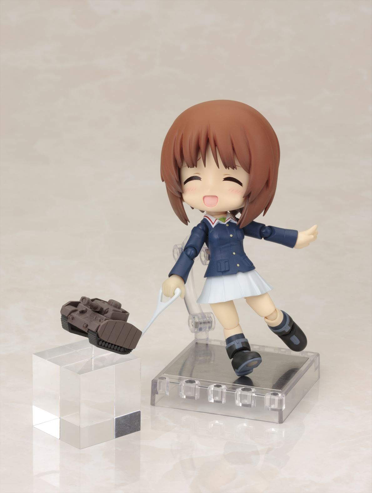 うごいてたのしいポケットさいずのキュートなふぃぎゅあ「キューポッシュ」シリーズ第25弾「西住みほ」。みほ達が駆るIV号戦車もキャラクターに合わせてデフォルメ&小型化され、キューポッシュ独自仕様としてリードを付けて一緒にお散歩ができます。