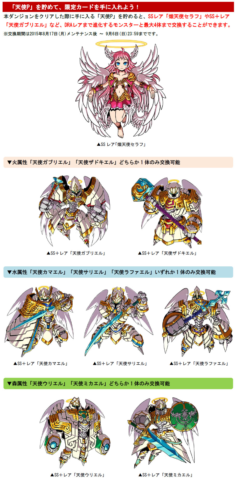 本ダンジョンをクリアした際に手に入る「天使P」を貯めると、SSレア「熾天使セラフ」や、SS+レア「天使ガブリエル」などDRAレアまで進化するモンスターと最大4体まで交換することができます。