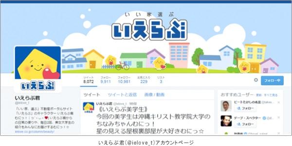 「いい家、選ぶ」不動産ポータルサイト「いえらぶ」のキャラクター「いえらぶ君」のツイッターアカウント「いえらぶ君(@ielove_t)」では「いえらぶコラム」による住まいと日常生活を豊かにする情報や、毎日2回、「いえらぶコラム」に登場する女子大学生のお部屋へのこだわりを配信中です。