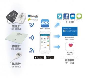 これらの機器で測定したデータは、無料で提供のスマートフォン向け専用データ管理アプリ「A&D Connect Smart」(iPhone版、Android版)で自動的に受信し、簡単・正確に記録することができます。記録された測定データは、スマートフォンで、いつでも、どこでも見る事ができ、大変便利な健康管理手帳となります。測定データのつけ忘れや転記ミスがなく、データ入力やグラフにする手間も要りません。また「A&D Connect Smart」はtwitterやFacebookなどのSNSによるデータの共有や、Microsoft社が提供するクラウド健康管理サービス「HealthVault」、Apple社が提供する「HealthKit」との連動も可能となっています。
