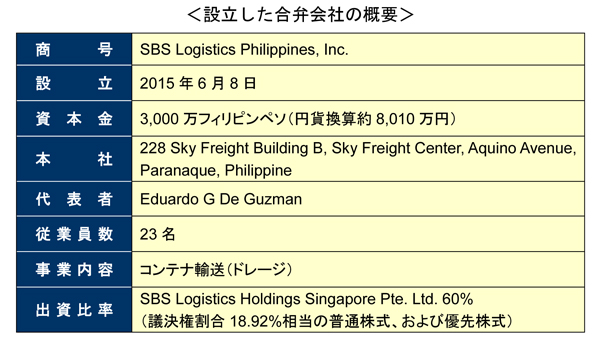 SBSグループは、フィリピンの有力フォワーダーであるSky Freight Forwarders Inc.を中核とするDe Guzman Group(以下「Sky Freight」)と合弁で物流会社SBS Logistics Philippines, Inc.(代表者Eduardo G De Guzman、以下「SLPH」)を設立し、8月24日よりコンテナ輸送(ドレージ)事業を開始しましたので、お知らせいたします。