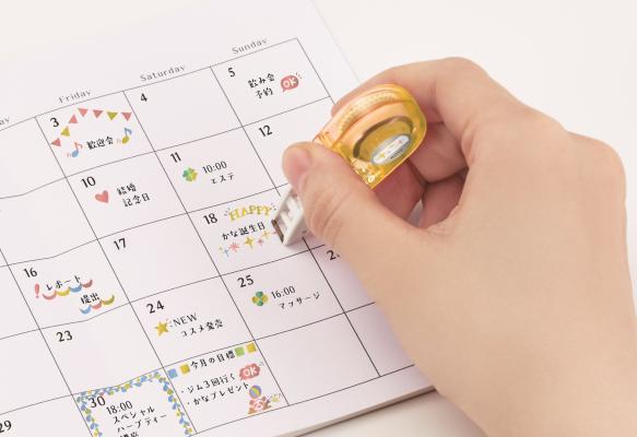 柄は、ワンポイントとして使える「誕生日」「飲み会」「デート」から「済み」「チェック」天気マークなどのアイコン、さらに大切な情報の縁取りに便利な細幅ラインなど全28柄を展開。男女を問わず手帳ユーザーのお客さまから大好評を頂戴しています。今回、「プチデコラッシュ」シリーズに新たに光沢インクを使用した「きらりプチデコラッシュ」が仲間入り!
