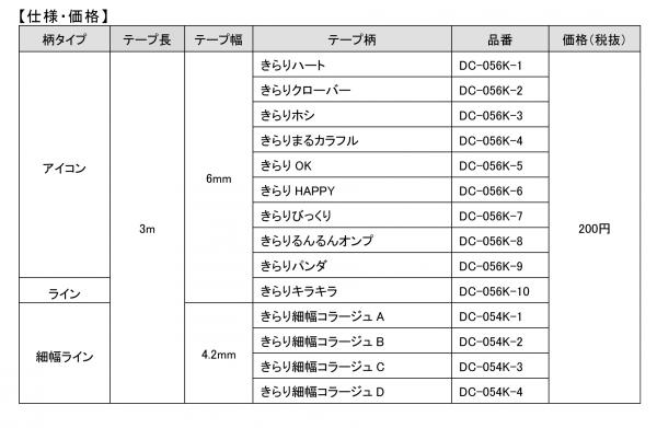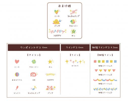 目立たせたい「ホシ」や待ち遠しい「るんるんオンプ」、強調したい時の「びっくり」など “アイコン” 9柄。6mm幅の“ライン”「キラキラ」1柄、シンプルなパターン柄の4.2mm幅“細幅ライン” 「コラージュ」4柄のラインアップです。