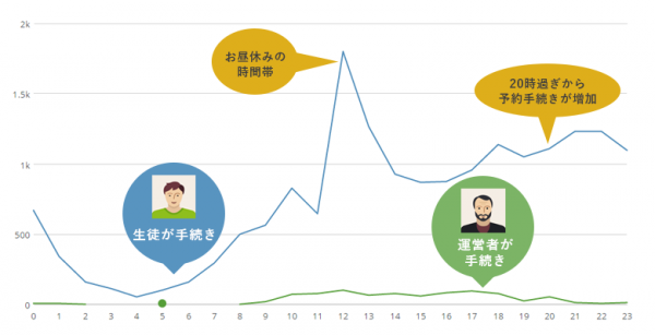 リザーブリンクの独自調査では、料理教室・クッキング講習会の申込みをネットから行う時間帯は、昼休みや夜間が多くなっています。これによりネット検索などでレッスン情報を収集し、料理教室の営業時間を気にせず申し込む利用者像が浮かび上がってきます。サイトの情報で「レッスンの様子がわかる」「気軽に申込める」ことが、新規顧客獲得のポイントであると言えます。