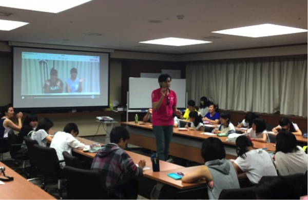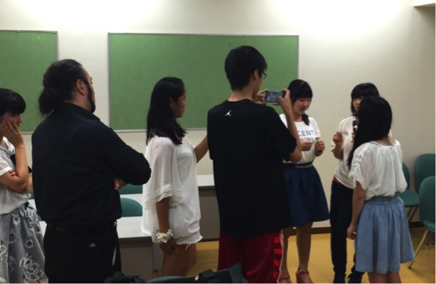 本企画には、外国語科に通う41名の学生たちが参加。2日間を通し、グループワークを中心とした様々な課題に取り組みました。中でも「スマートフォンを利用して英語のニュース番組を制作する」最終課題では、チームメイトと協力し、キャスターやカメラマン、編集など、受け持った役割へ積極的に取り組む学生たちの姿が随所で見受けられました。また、学生たちが制作した各ビデオ作品には、大きな笑いと拍手が送られました。