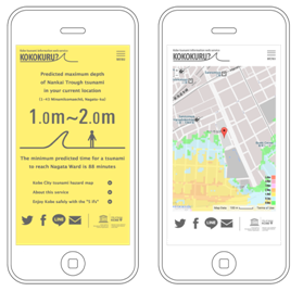 神戸市内にいる不特定多数の方々が、どこでも津波避難の情報を入手できるツールとして、スマートフォンに対応したウェブサービスです。主な内容は、