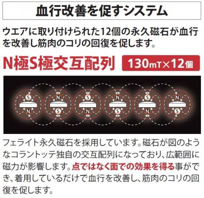 フェライト永久磁石を採用しています。磁石が図のようなコラントッテ独自の交互配列になっており、広範囲に磁力が影響します。点ではなく面での効果を得る事ができ、着用しているだけで血行を改善し、筋肉のコリの回復を促します。