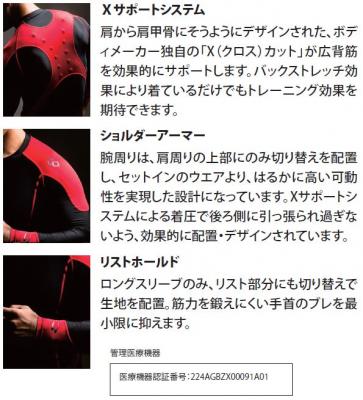 肩から肩甲骨にそうようにデザインされた、ボディメーカー独自の「X(クロス)カット」が広背筋を効果的にサポートします。バックストレッチ効果により着ているだけでもトレーニング効果を期待できます。