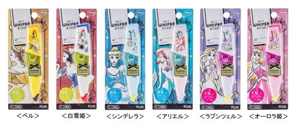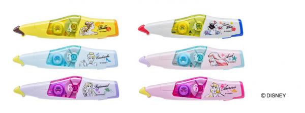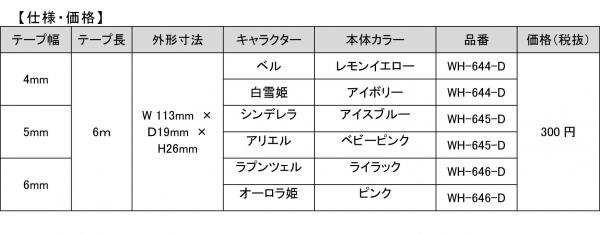 ベル(レモンイエロー/テープ幅4mm)、白雪姫(アイボリー/同4mm)、シンデレラ(アイスブルー/同5mm)、 アリエル(ベビーピンク/同5mm)、ラプンツェル(ライラック/同6mm)、オーロラ姫(ピンク/同6mm)の6種類。 メーカー希望小売価格(税抜)は300円。交換テープは定番品「ホワイパーPT」と共通で130円です。