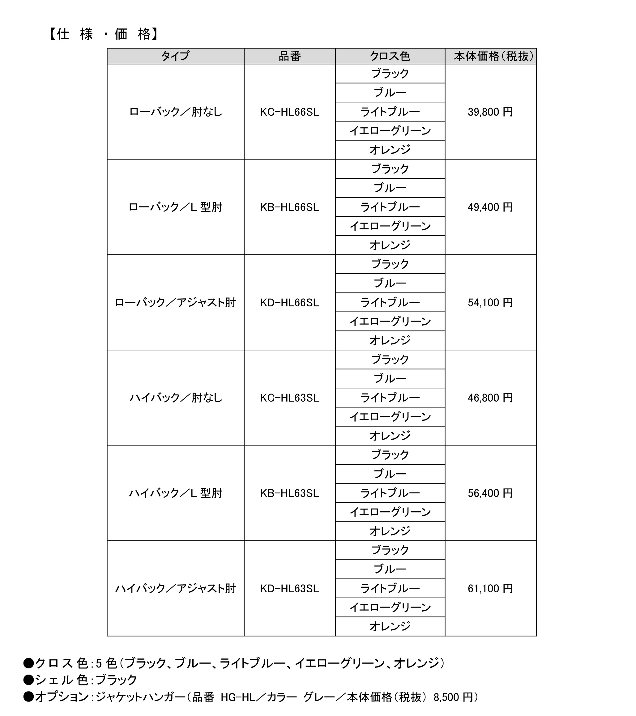 種類は、ローバック・ハイバック、肘なし・L肘付・アジャスト肘付、クロス色(5色)の組み合わせによる全30アイテム。価格(税抜)は39,800~61,100円です。