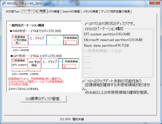 「Windows10アップグレードチェッカー」はディスクのパーテーションの構成サイズを調べディスク構成がアップグレードに適しているか調べます。