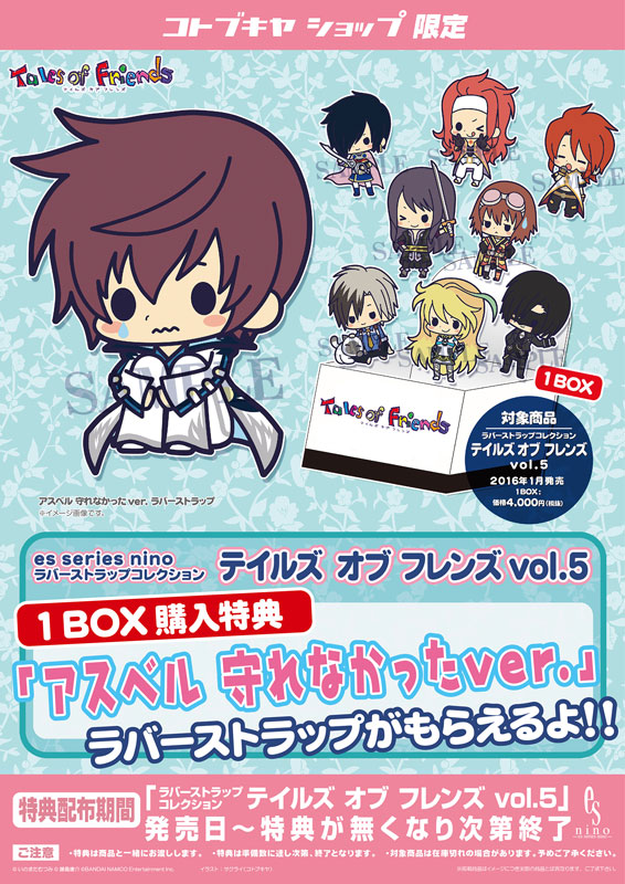 デフォルメは、人気イラストレーター・サクライ氏が担当。ラバーストラップ化初、人気のイラストばかりをあつめた待望のラインナップとなっています。キャラクターは[リオン・マグナス(テイルズ オブ デスティニー)、ゼロス・ワイルダー(テイルズ オブ シンフォニア)、ルーク・フォン・ファブレ(テイルズ オブ ジ アビス)、ユーリ・ローウェル(テイルズ オブ ヴェスペリア)、リタ(テイルズ オブ ヴェスペリア)、ミラ=マクスウェル(テイルズ オブ エクシリア2)、ルドガー・ウィル・クルスニク&ルル(テイルズ オブ エクシリア2)、ヴィクトル(テイルズ オブ エクシリア2)]の全8種。大きさは約5cmと携帯電話や鞄などに付けるのにぴったりなサイズ。キャラクター部分だけの取り外しが可能で、好きなキャラクターだけを集めて携帯するなど遊びの幅が広がります。さらにコトブキヤショップでBOX購入すると、「アスベル 守れなかったver.」ラバーストラップが付属します。