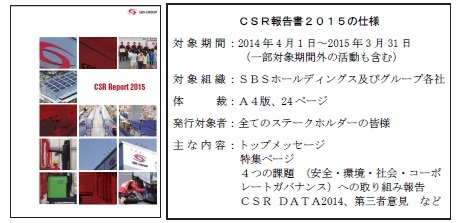 SBSグループは、本日「SBSグループCSR報告書2015」を発行しましたのでお知らせいたします。2009年に環境報告書を、翌年から範囲を拡大してCSR報告書とし、今年で7回目の発行となります。当社ウェブサイト(http://www.sbs-group.co.jp/hdg/csr/report/)に掲載し、ダウンロードも可能です。当グループのCSR活動の全容を是非、ご覧ください。