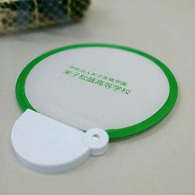 鳥取県米子市の私立高校が主催するソロバン大会(第5回 松蔭杯塾対抗珠算競技大会)にて、参加賞として進呈されたフォールディングファン。ファン中央に印刷されたのは、「高い知性と豊かな情操の育成」や「実践的人材の養成」を教育目標とする同校シンボル。また、オープンスクールの記念粗品としても活用することが計画されていたため、少し多めに作成し備えられたそうです。