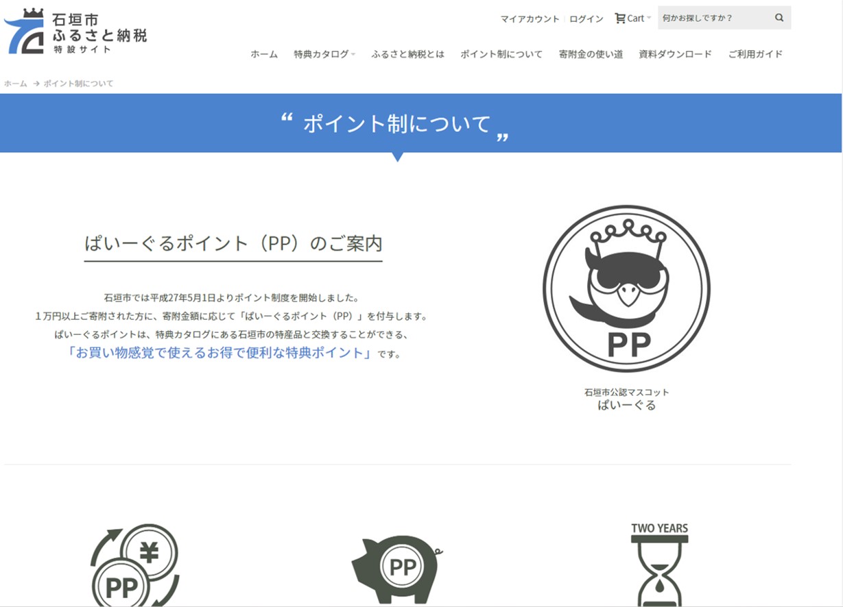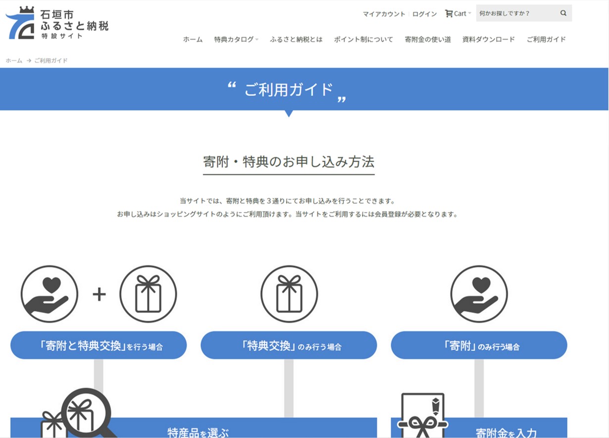 新たにオープンした「石垣市 ふるさと納税特設サイト」は、従来のレイアウトから大幅にデザインを変更し、イメージやビジュアルを多用することで、制度概要や寄附の申し込み手順だけではなく、特産品・返礼品などの情報も分かりやすくて探しやすい、シンプルなサイト構成となっています。合わせて、ユーザビリティを高める工夫としてマイアカウント機能(会員機能)を用意し、寄附申し込み時に登録していただくことで、次回より面倒な住所入力などを省略できるとともに、寄附金額に応じて付与されるポイント数の保有状況やこれまでの申し込み履歴などをいつでもご確認いただけます。
