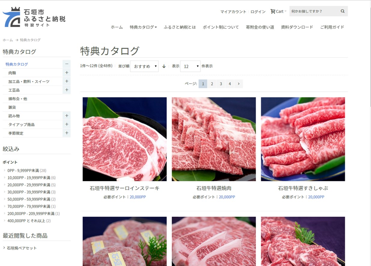 特設サイトでは、ふるさと納税の手続きが簡素化され、寄附金の入金からお礼の特産品の注文まで、ワンストップでお申込みいただけます。また、お礼の特産品も石垣牛をはじめとし、地ビール、スイーツなどのグルメのほか、伝統工芸品のミンサーなど計48点に拡充しました。