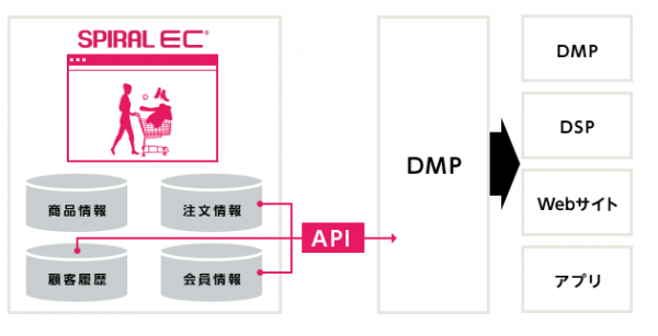 オンラインショップ会員の注文情報や行動履歴などのパーソナルデータを、APIを通じてDMPやレコメンドエンジンと連携すれば、お客様ごとに最適な情報発信や広告掲載などの施策によるリピートが期待できます。
