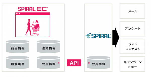 「スパイラル(R)」でメール配信や顧客アンケート、キャンペーンなどを実施している場合、例えばアンケート回答時に受け付けた会員情報の変更を、自動でSPIRAL EC(R)の会員情報データベースに反映できるため、会員情報管理の手間削減と、「スパイラル(R)」を活用した多様なマーケティング施策を柔軟に両立できます。