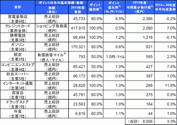 株式会社野村総合研究所(本社:東京都千代田区、代表取締役会長兼社長:嶋本 正、以下「NRI」)は、家電量販店やクレジットカード、携帯電話など、国内11業界の主要企業*1が1年間に発行するポイント・マイレージを現金換算した「年間最少発行額(下記の注を参照、以下「最少発行額」)」について、2013年度実績の推計および2020年度までの予測を行いました。