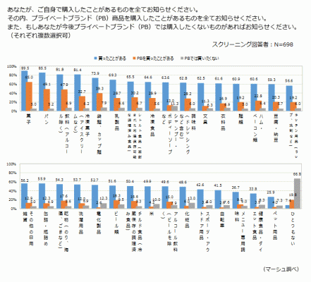 インターネット調査会社の株式会社マーシュ(東京都渋谷区渋谷、代表取締役:町田正一)は、全国、15~69歳、『PB食品』を自分で購入したことがある方を対象に「プライベートブランド(PB)に関する調査」を実施しました。