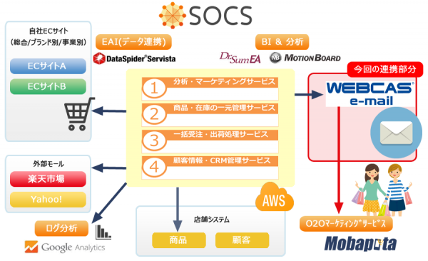 SIとエイジアは2012年4月9日に資本・業務提携を行っており、以来、SIのECサイト構築パッケージ「SI Web Shopping」とエイジアのメールマーケティングシステム「WEBCAS e-mail」の連携ソリューションを多くの企業に提供しています。 今回は領域をさらに広めて、SIの新しいクラウドサービス「SOCS」とエイジアの「WEBCAS e-mail」の連携を行い、オムニチャネルの観点においても小売業全体に幅広くサービス提供するものです。