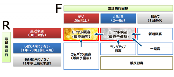 図2は、このうちRF分析により顧客を分類したものです。最近来店して購入頻度も高い顧客がロイヤル顧客(優良顧客)、優良顧客だったのにしばらく来ていない顧客をカムバック顧客(離反予備軍)などとカテゴライズし、企業は優良顧客を増やすためのプロモーションを考えて実施します。