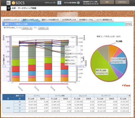 プロモーションを行った場合には、その効果も測定・分析していかなければなりません。「SOCS」はこのような分析サービスも数多く提供しています。たとえば画面1はRF分析でカテゴライズした顧客数の推移グラフです。ロイヤル顧客をキープできたか、カムバック顧客を呼び戻すことができたか、という効果を数値で確認し、次のプロモーションに活かします。