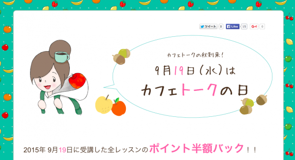 ご受講頂いたレッスンが最大3件まで、後日半額ポイントバックされるユーザー様感謝デーの「カフェトークの日」。勉強はもちろんスポーツや趣味に精を出すにはピッタリの初秋9月も、19日に開催致します!