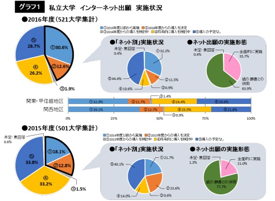 旺文社『螢雪時代』編集部では、全4(6)年制大学(751大学。通信制を含む)に対し、インターネット出願(以下、ネット出願)と、それに伴う受験料割引(ネット割)の2016年(以下、16年)入試における実施についてアンケート調査を行い、9月上旬までに国公立156大学、私立521大学から回答を得た(回収率=90.1%)。
