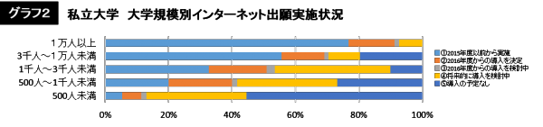 *各大学の15年一般入試の志願者総数で5グループ(非公表等の大学を除く)に分けて集計すると(グラフ2)、ネット出願実施校((1)(2)合計)の比率は「1万人以上」で約91%と最も高く、次いで「3千人~1万人未満=約69%、1千人~3千人未満=約51%、500人~1千人未満=約40%、500人未満=約11%」と続く。規模の大きさとネット出願の導入率はほぼ比例。分岐点は前年と比べ「志願者1千人以上→500人以上」に下降(小規模大学にも普及)。