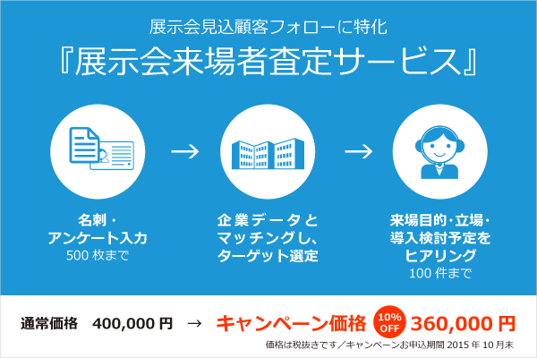 アイアンドディーは、これから展示会シーズンを迎える中、出展後のフォローを検討されているご担当者様を対象とした、名刺・アンケート入力から企業データ付与(ターゲット分析)、来場御礼電話での興味・検討状況のヒアリング迄を一環で行う効果的で効率的なサービスを特別価格でご提供いたします。