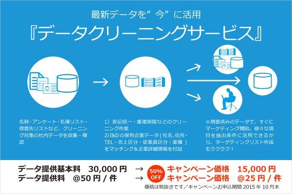 50%OFFキャンペーン価格 データ提供基本料15,000円 + データ提供料@25円/件 でご提供