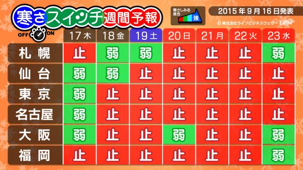 17日(木)は、北・東日本を中心に冷たい雨が降り、寒さスイッチ「弱」がONになりそうです。そのあと北日本は19日(土)にかけて「弱」の所がありますが、まだ冷たい空気が居座ることはありません。シルバーウィーク中、スイッチはOFFの所が多いでしょう。