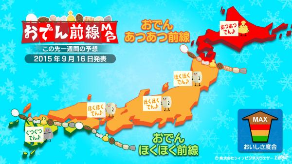 『おでん前線』とは・・・体感気温などの要素からLBW独自のアルゴリズムから導きだした「おでんの食べ頃」を伝える予報。おでんの「今が食べどき!」というタイミングがわかります。