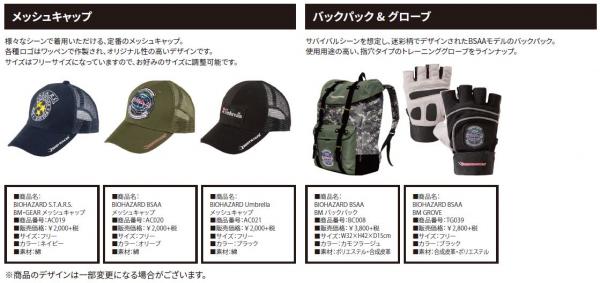 サバイバルシーンを想定し、迷彩柄でデザインされたBSAAモデルのバックパック。使用用途の高い、指穴タイプのトレーニンググローブをラインナップ。