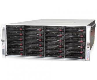 24 台までのドライブが接続可能なリムーバブルベイ上の HDD/SSD は、ハードディスク・バックプレーンに組み込まれた 12Gbps SAS エキスパンダーを介して、PCI-Express バス上の LSI 3108 コントローラによる、4チャンネル 12Gbps SAS/SATA ハードウェア RAID コントローラに接続されます。12/6Gbps SAS/SATA ディスクの使用が可能で、RAIDドライブのホットスワップ機能、ホットスペアー機能など、充実したデータ保護環境が利用できます。