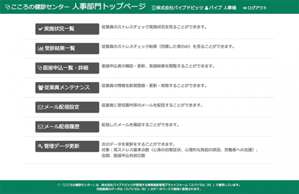 パイプドビッツでは、ストレスチェック義務化の5年前にあたる2010年春より、「スパイラル(R)」で構築したオンライン診断ツールによる月1回のストレスチェックを全従業員に継続してまいりました。その中で得られた「ストレス絶対値は個人ごとに感じ方の差が出るが、同従業員の値に特異な変化が発生した時こそケアのタイミング」等の蓄積した運用ノウハウを盛り込み、メンタルヘルス不調「予備軍」を早期発見できる機能と併せて、人事部門の業務を極力省力化する事務従事者代行機能を多数搭載した「こころの健診センター」を開発しました。「こころの健診センター」の提供を通じて、企業が事業経営の一環として積極的にストレスチェック制度を活用した職場改善ひいては生産性の向上を支援してまいります。
