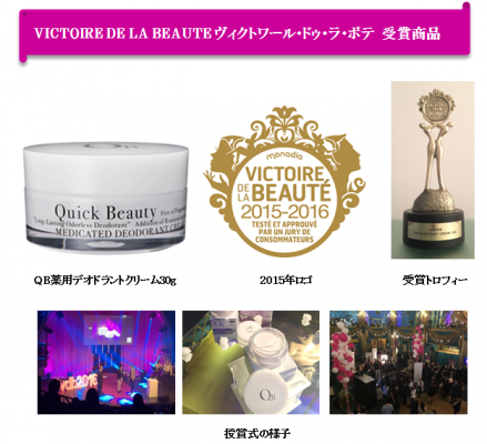 株式会社リベルタ(本社:渋谷区 代表取締役:佐藤透)は、フランスのビューティーアワード『VICTORIE DE LA BEAUTE(ヴィクトワール・ドゥ・ラ・ボテ)』において、「QB薬用デオドラントクリーム30g」が初受賞しました。