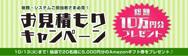 BTOパソコンを販売しているFRONTIERダイレクト(http://www.frontier-direct.jp/)では、お見積りをご依頼いただいたご担当者様に、抽選で20名様にAmazonギフト券(Eメールでお届け)5,000円分をプレゼントするお見積りキャンペーンを開催いたします。