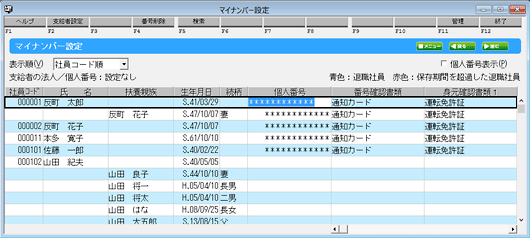・[マイナンバー設定]で、社員・扶養親族の個人番号や支給者の法人番号/個人番号の入力などの管理を行います。