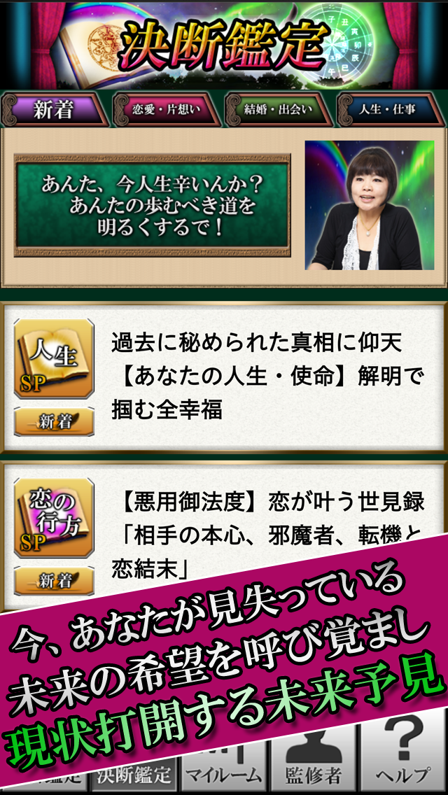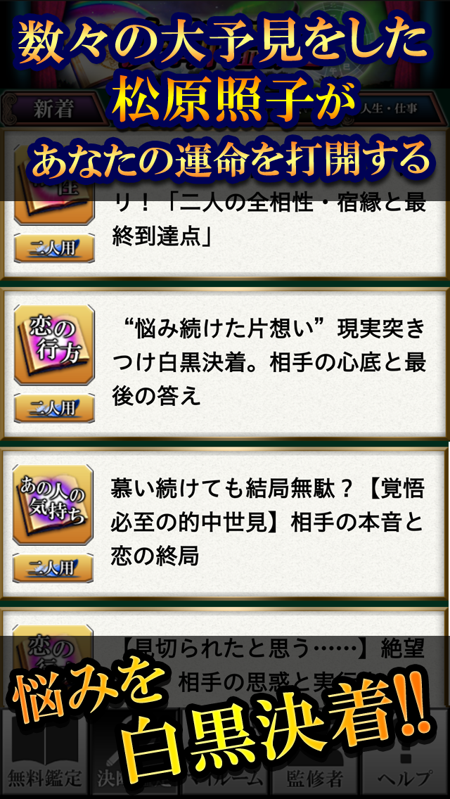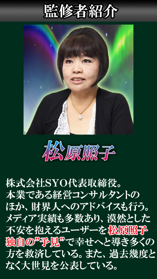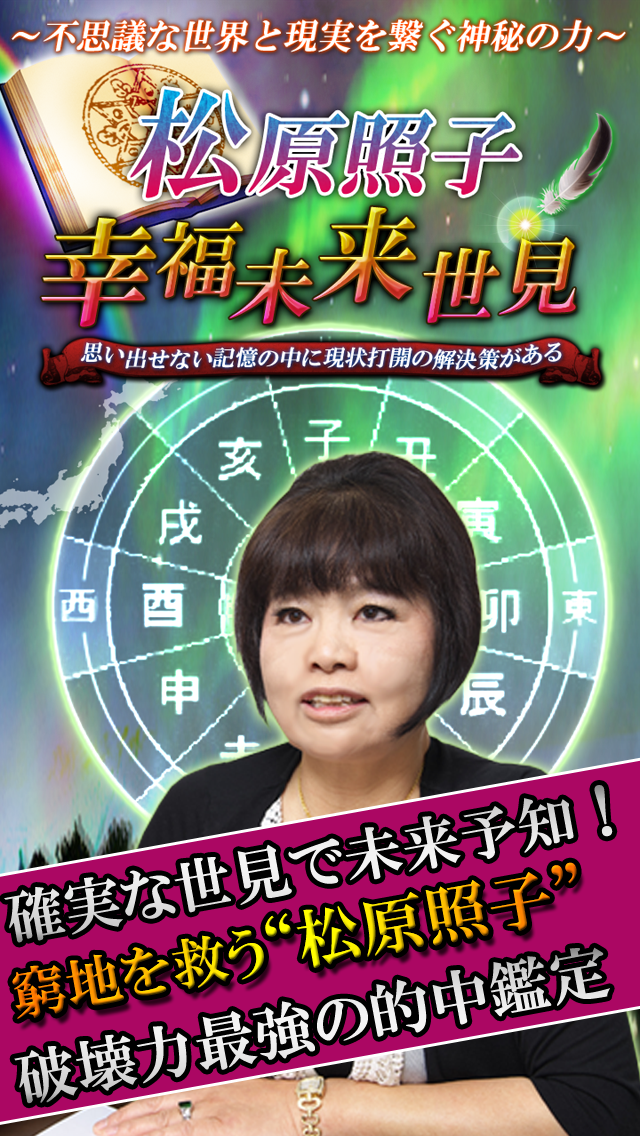 ユーザーの過去の経験・記憶に隠された答えを探り、自分との会話で“生き力”を磨き、記憶の中、潜在意識の中に刻まれている自らの使命を改めて理解することで多くの問題を解決に導いてきました。当アプリでは、“十二支”と“出生地×血液型”を元にあなたの将来の幸せ等について詳細な鑑定を行っていきます。松原照子の過去実績や鑑定の正確さ・精密さなども加わっているのできっとご満足いただける結果に出会えるでしょう。